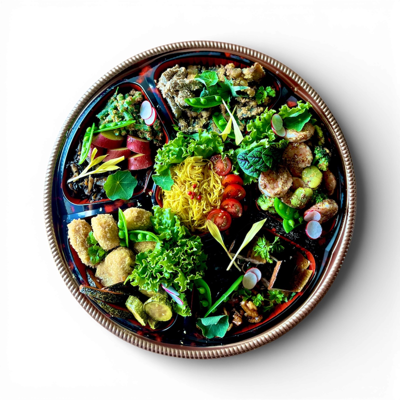 カレーに車麩カツ・サラダ・おばんざい付きのセットとなります。
